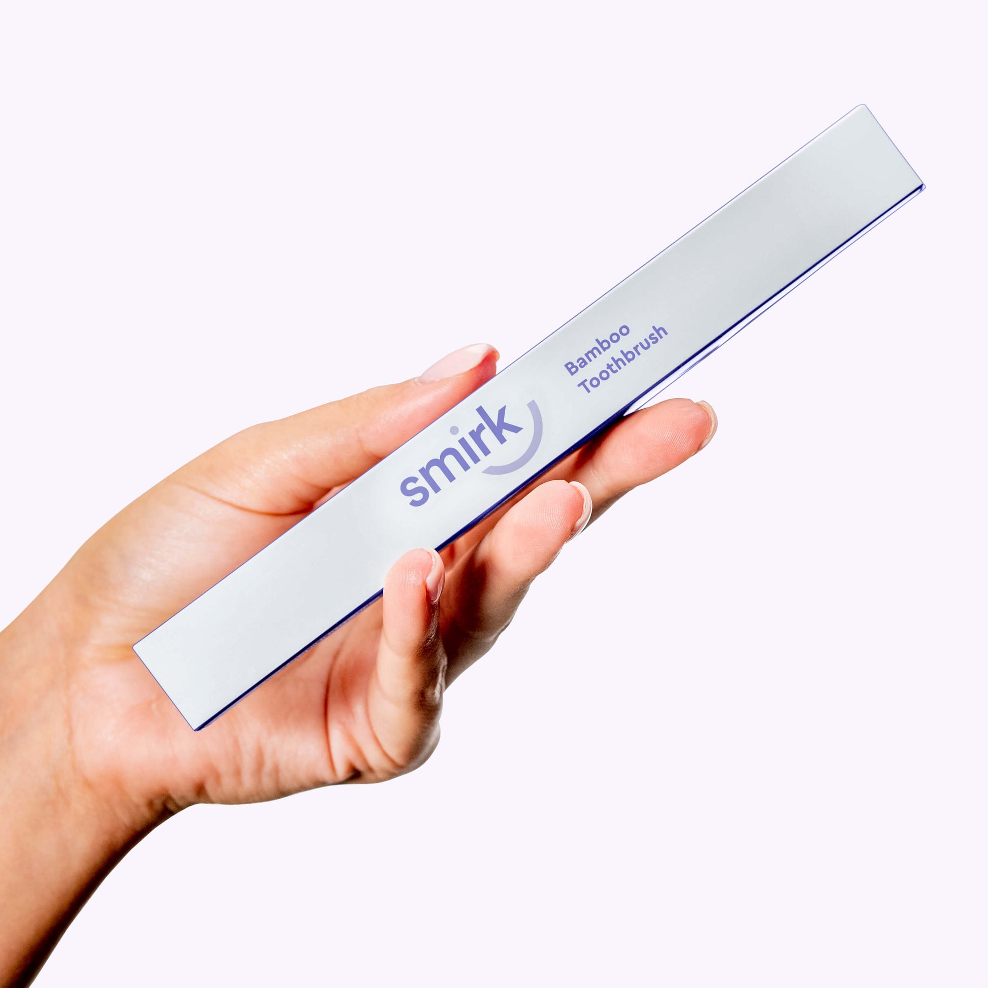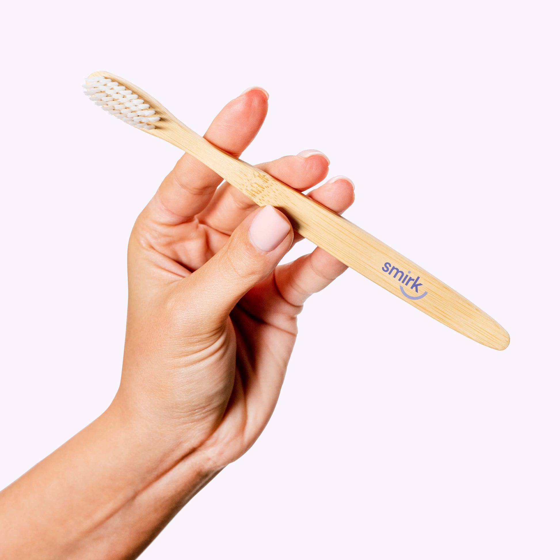 Environmentally friendly and recyclable toothbrush made from bamboo. Gentler stain removal with Smirk® Teeth Whitening Powder.